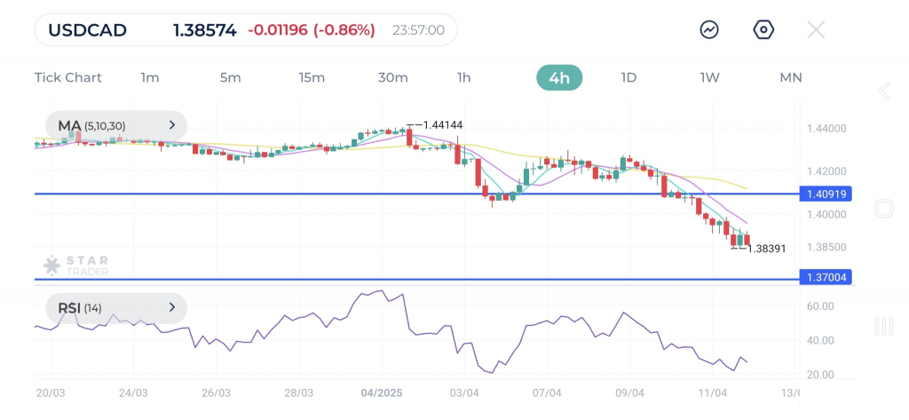 USD/CAD has broken out of its prolonged consolidation phase, where it was range-bound between 1.4030 and 1.4500. The prior bullish trend stalled, giving way to a sideways market as momentum faded. Eventually, a strong bearish breakout occurred below the lower boundary, with a brief retest of the SMA. Bears are now targeting 1.3700, a key level where a temporary pause is possible as the SMA begins to catch up and the RSI is deep in oversold territory. If sellers manage a decisive break below 1.3700, it would open the door toward the 1.3400 key support. The downtrend is expected to persist as long as the price remains below the SMA and 1.4090.